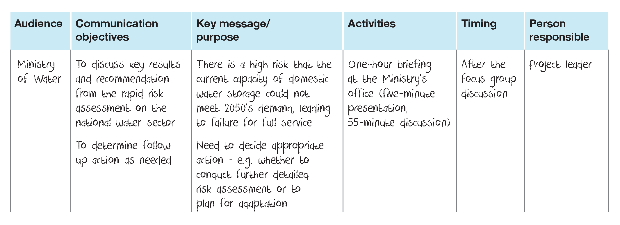 Much like a stakeholder engagement plan (step 1), a communication plan is a valuable tool for ensuring the intended key messages are communicated to identified audiences at an appropriate time using appropriate methods. A simple table, such as in the following example, that sets out the audience, communication objective, key message, method, timing and person responsible is all that is needed to manage effective and efficient communication.